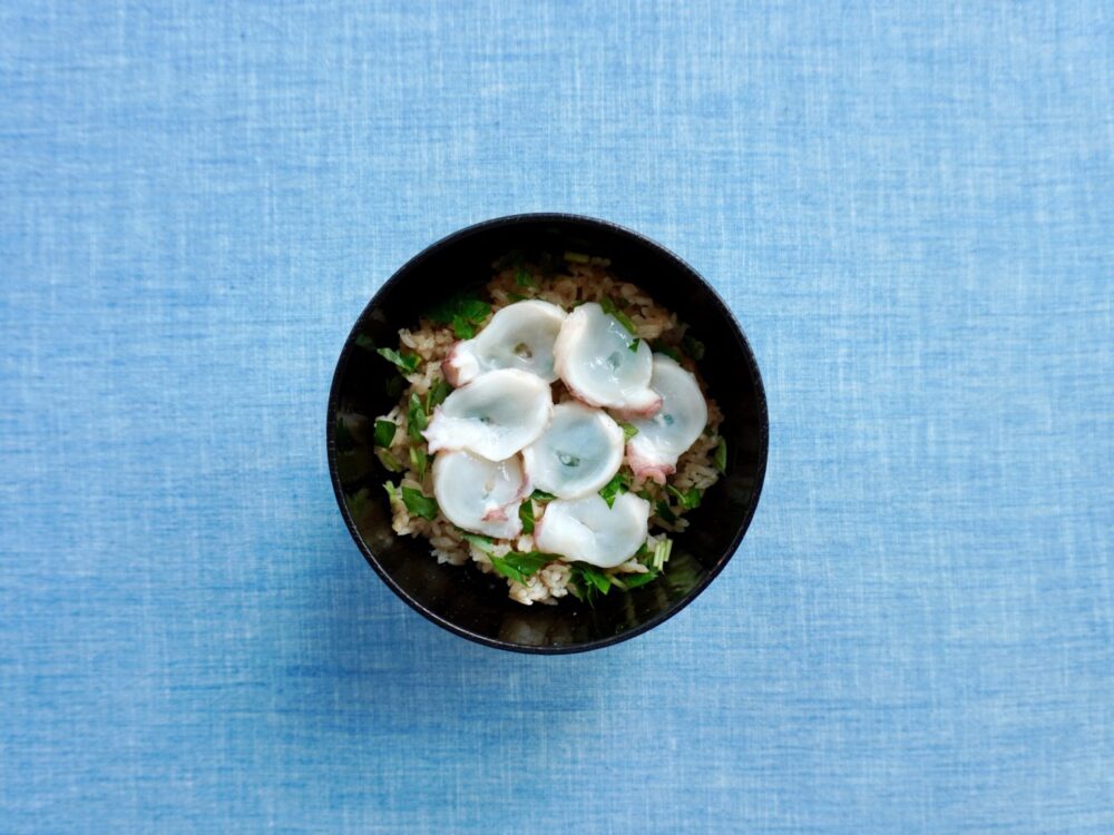 ジューシーな食感を残すため蒸し煮にしたミズダコの煮汁でご飯を炊き上げました。柔らかくみずみずしいミズダコの食感と旨味をお楽しみください。