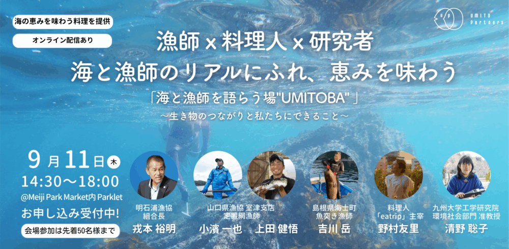 株式会社UMITO Partners(東京都中央区、代表取締役:村上春二)は、全国の漁業者がそれぞれの目の前の海の課題と向き合い、主体的にアクションを起こすためのコミュニティ「UMITOBA(ウミトバ)」の初となる対面イベントを、2025年9月11日(木)、東京都新宿区・明治公園内Parkletにて開催いたします。