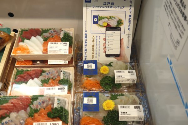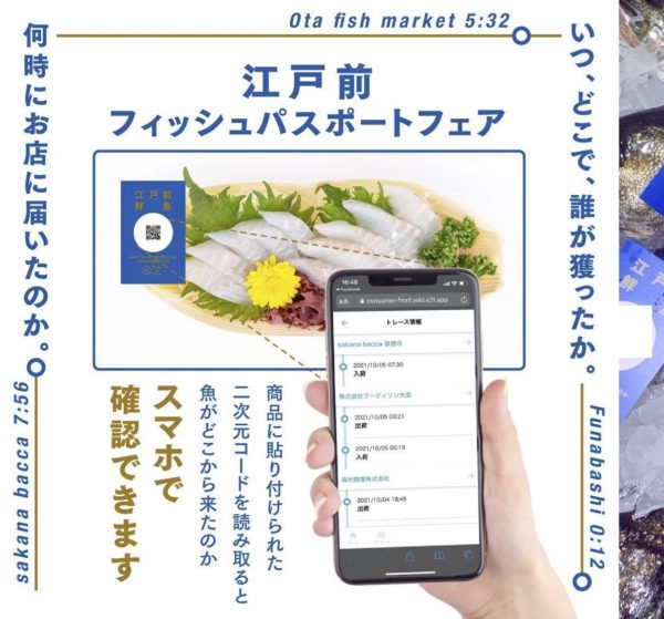 と、大野さんは話します。もともとアメリカでブロックチェーンを活用したトレーサビリティシステム”IBM Food Trust”を展開するIBM社から、日本の水産物でも実装できないかとUMITO Partnersに声がかかったことをきっかけに、海光物産・大傳丸・中仙丸に加えて複数のIT企業とともにスタートしたO2T。このプロジェクトにおいて「江戸前フィッシュパスポート」と称して、魚ひとつひとつに、いつ・どこで・誰が漁獲したか、お客さんの手元にどのように届いたかをアプリ上で確認できるQRコードをつけて流通させたり、大野さんら漁師自ら魚屋の店頭にたって対面販売を行うなど、様々な方法でトレーサビリティの実現を目指してきました。